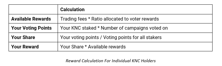 The network fee percentage and fee allocation ratio are decided by the KyberDAO. As an individual KNC staker, your share of the rewards received after the epoch will be determined by your voting points (the amount of KNC you have staked during the epoch x the number of campaigns you voted on), in proportion to the total voting points of all KNC stakers.