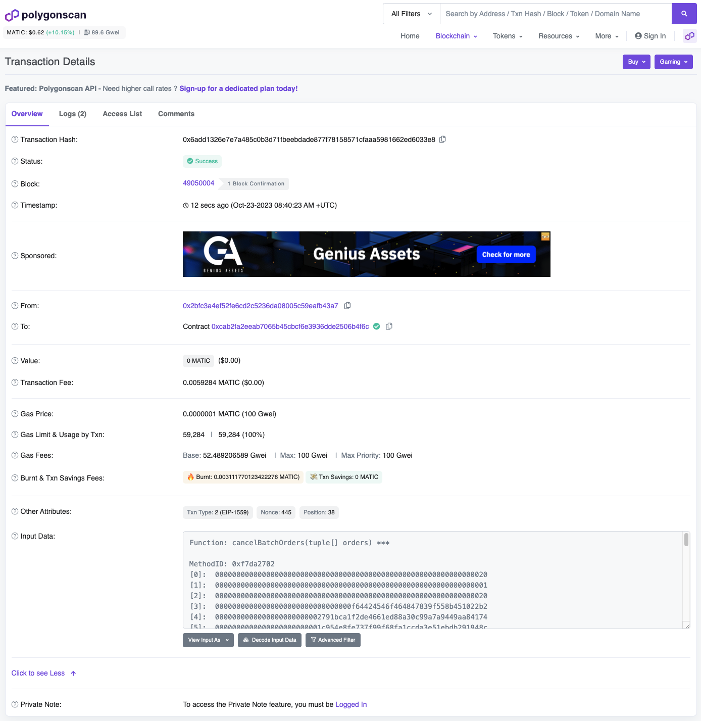 A transaction hash will be returned once the cancel order has been executed. You can copy this hash into a scanner (i.e. [PolygonScan](https://polygonscan.com/)) and see that your transaction has been successfully completed by the network.