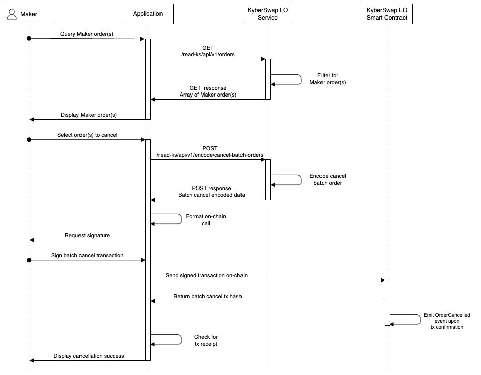 * [**`/read-ks/api/v1/encode/cancel-batch-orders`**](https://docs.kyberswap.com/kyberswap-solutions/limit-order-api-specification/maker-apis#read-ks-api-v1-encode-cancel-batch-orders): Encode the batch cancellation data to be sent on-chain. This API can be used to cancel a single `orderId` or multiple orders by specifying the target `orderIds`.