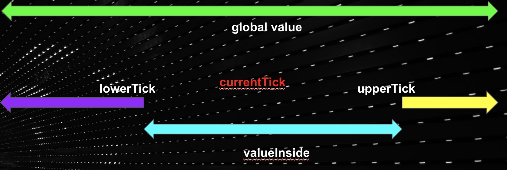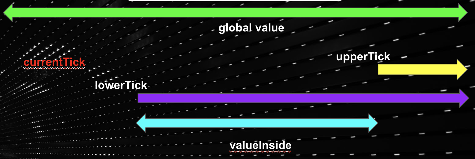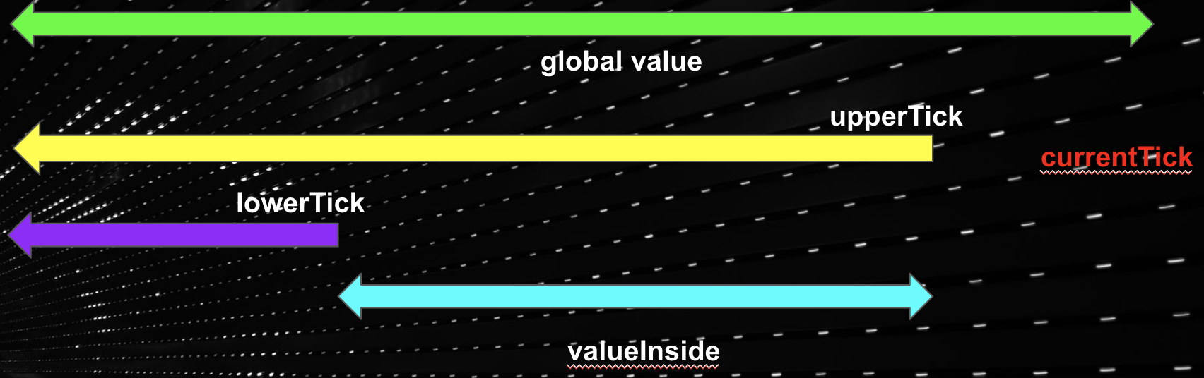 The outside value (feeGrowthOutside and secondsPerLiquidityOutside) for a tick represents the accumulated value relative to the currentTick. By definition, we can visually represent it to be as such: