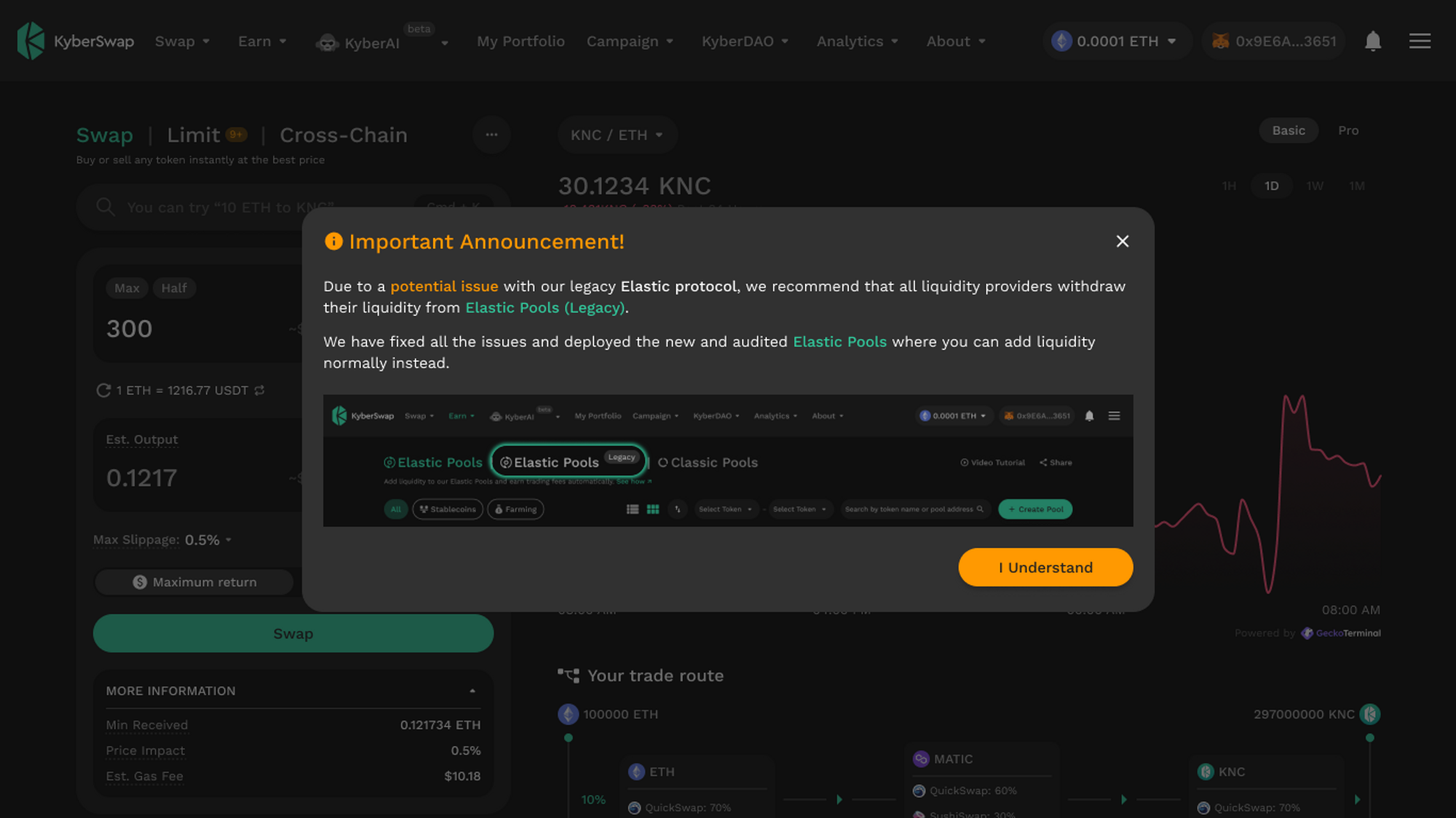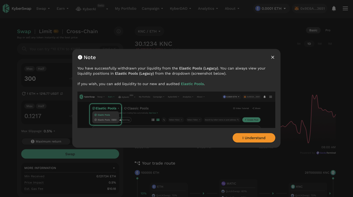 This guide is targeted at users who still have tokens in the old Elastic Legacy contracts. As trades against Elastic Legacy contracts have been disabled to ensure the safety of liquidity provider funds, it is highly recommended that such idle funds be removed from Elastic Legacy. Users always maintain control over their own funds and are free to decide how best to utilize their funds whether it is for [yield farming in the newly audited Elastic contracts](https://github.com/KyberNetwork/kyberswap-documentation/blob/main/reference/legacy/elastic-legacy/broken-reference/README.md) or other purposes.