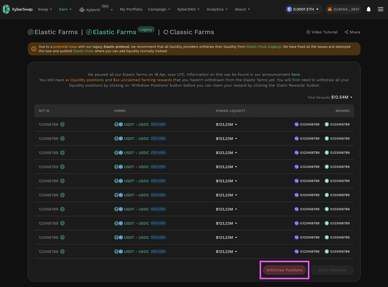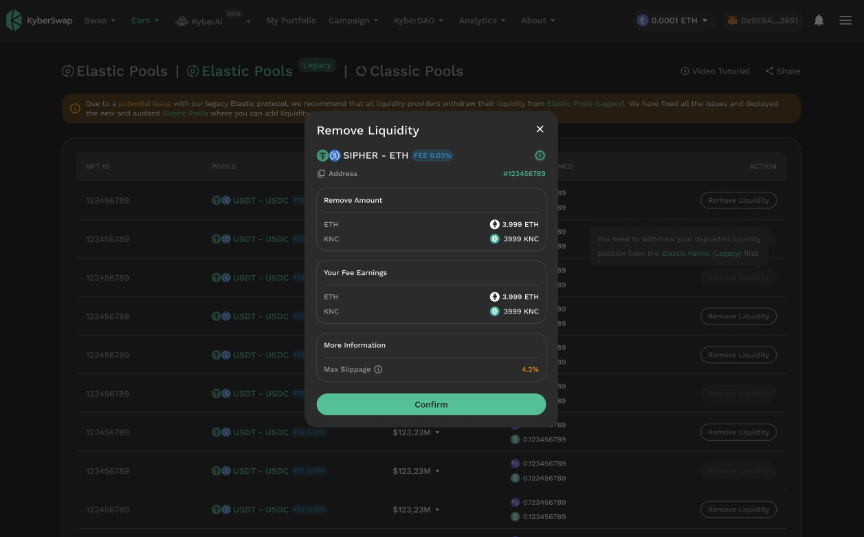 Upon [connecting your wallet](https://docs.kyberswap.com/user-guide/user-guides/connect-your-wallet) to KyberSwap, you will be prompted with a notification if there are existing liquidity positions on KyberSwap Elastic Legacy that are linked to your address.