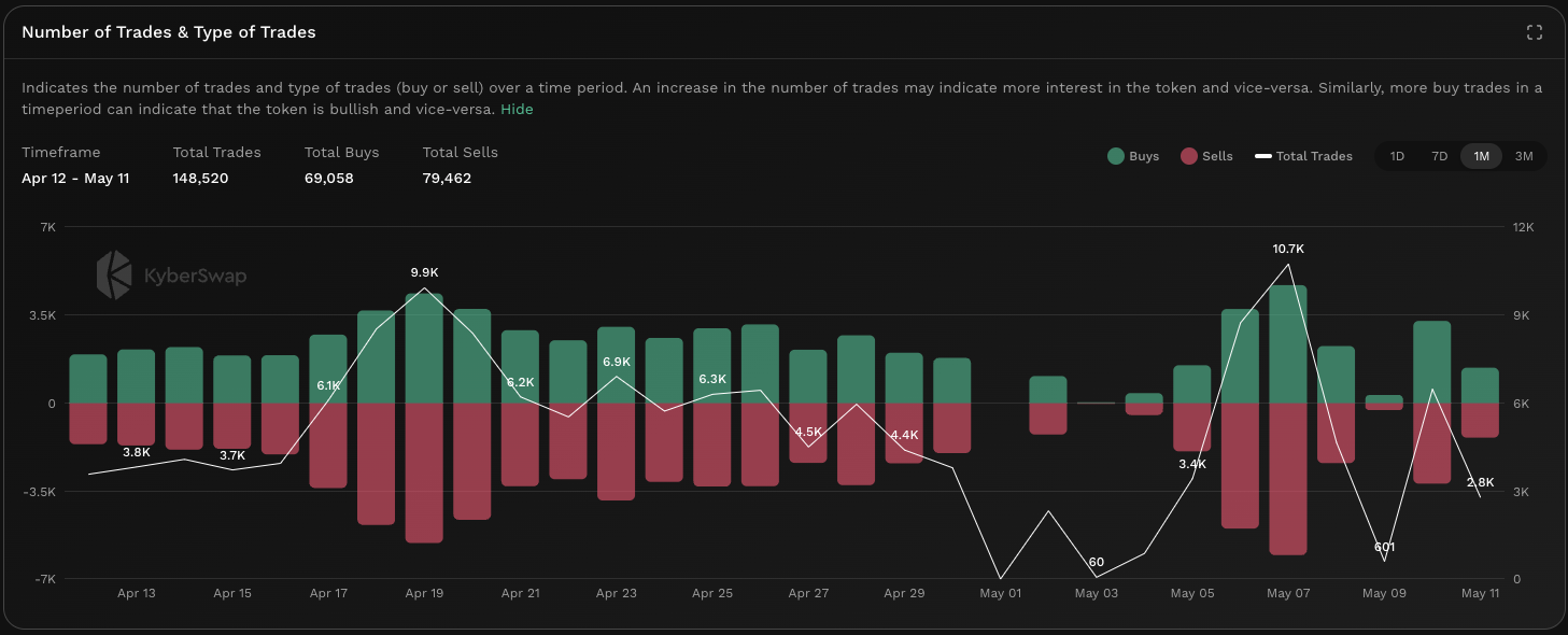 The number of trades counts the total swaps and swap types which have occured across various [DEXs](https://github.com/KyberNetwork/kyberswap-documentation/blob/main/reference/legacy/kyberai/on-chain-indicators/broken-reference/README.md) for the specific token. Trades are split into two categories with green indicating a buy and red indicating a sell. By comparing the totals of each trade type, users will be able to get a sense of the relative buy/sell pressure based on trade counts. Moreover, when comparing trade counts across past periods, it is also possible to deduce whether interest in the token has increased or decreased based on the history of the specific token.