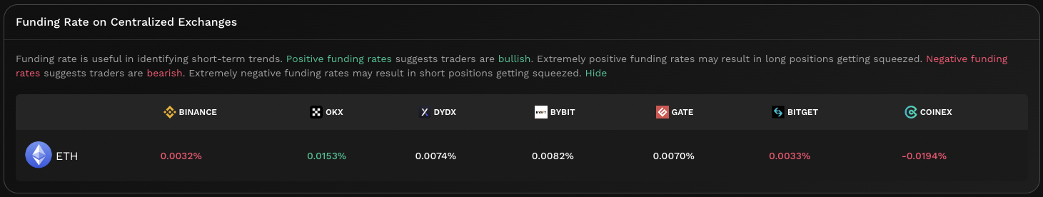 Note that funding rates are dependent upon CEXs supporting contracts for the token. In cases where there are no CEX contracts for the token, no funding rate will be displayed.