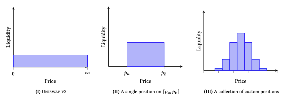 Keeping with the core design of the earlier version, it was discovered that liquidity could be better utilized if pools were created with a more tightly bounded price curve. For example, instead of uniformly distributing liquidity across a 0 → ∞ range, the lower and upper bound of the range should approximate the the price interval which the token pair regularly trades at. This meant that capital efficiency was greatly amplified the narrower the supported price range (i.e. a range of 0.99 → 1.01 instead of 0.9 → 1.1 is roughly 10x more capital efficient).