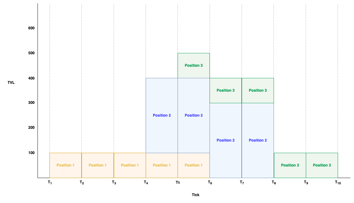 <table><thead><tr><th width="115.33333333333331">Position</th><th width="126">Total Value</th><th width="152">Tick Range</th><th width="148">Tick Intervals</th><th>TVL Per Tick Interval</th></tr></thead><tbody><tr><td>1</td><td>500</td><td><span class="math">T_1 - T_6</span></td><td>5</td><td>100</td></tr><tr><td>2</td><td>1200</td><td><span class="math">T_4 - T_8</span></td><td>4</td><td>300</td></tr><tr><td>3</td><td>500</td><td><span class="math">T_5 - T_{10}</span></td><td>5</td><td>100</td></tr></tbody></table>
