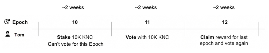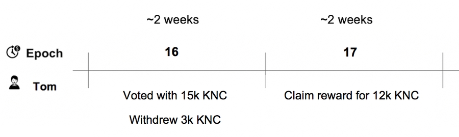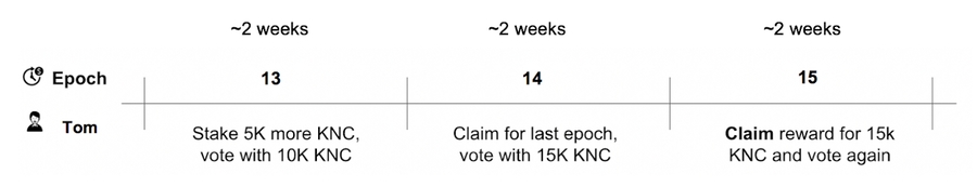 Epoch 13: Tom can vote with 10,000 KNC worth of voting power in this epoch. Tom stakes another 5000 KNC. Now he has staked 15,000 KNC in total.
